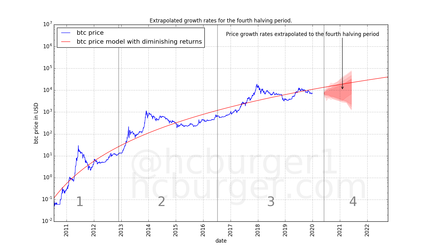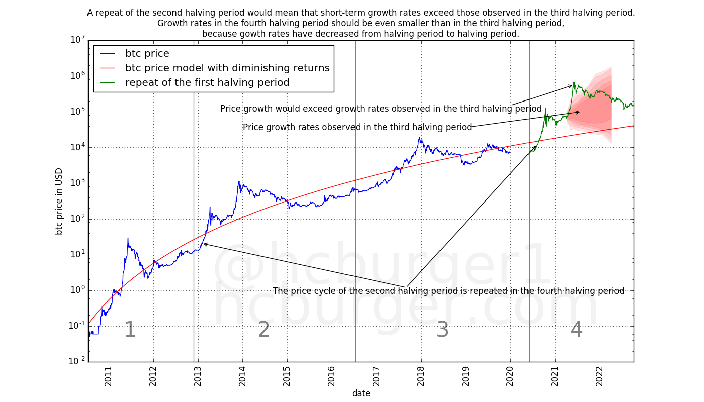 Assuming 0 price growth until the third halving, and using extrapolated statistics for the fourth halving period, we get the following possible price movements.