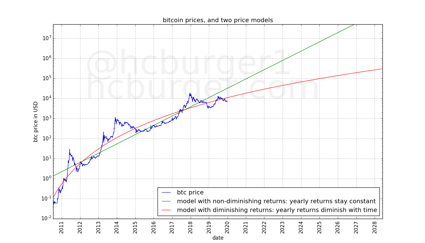 It appears that it is believed by some that bitcoin’s price will grow with non-diminishing returns, leading to some price predictions being made that are more in-line with the model with non-diminishing returns than with the model with diminishing returns: