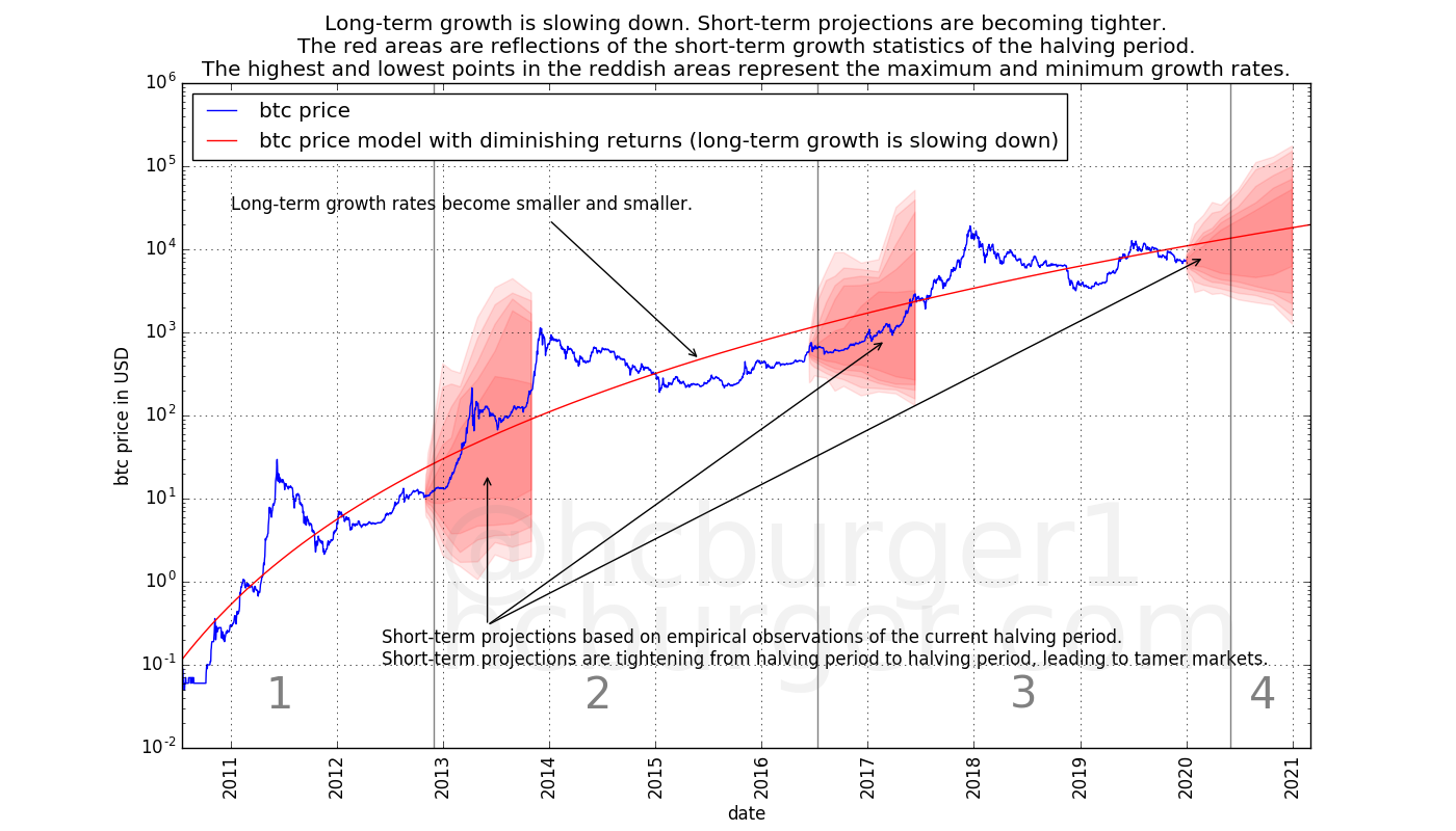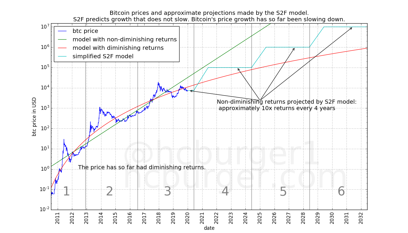 Also, it is not quite correct to say that the S2F model has non-diminishing returns: In the early history, returns as modeled by the S2F model are indeed diminishing. The returns only diminish up to a certain point, though (approximately a 10x return every 4 years).