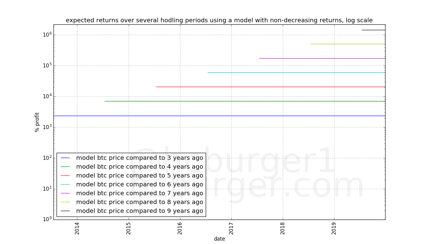 Let’s assume that bitcoin’s price follows a non-diminishing model. How much money can an investor expect to make? The answer depends on the amount of time the investor held his bitcoin before selling them (the “hodling period”). The longer the hodling period, the higher the expected return. What is interesting is that for the model with non-diminishing returns, the profit the investor can expect to make does not depend on when he invested.