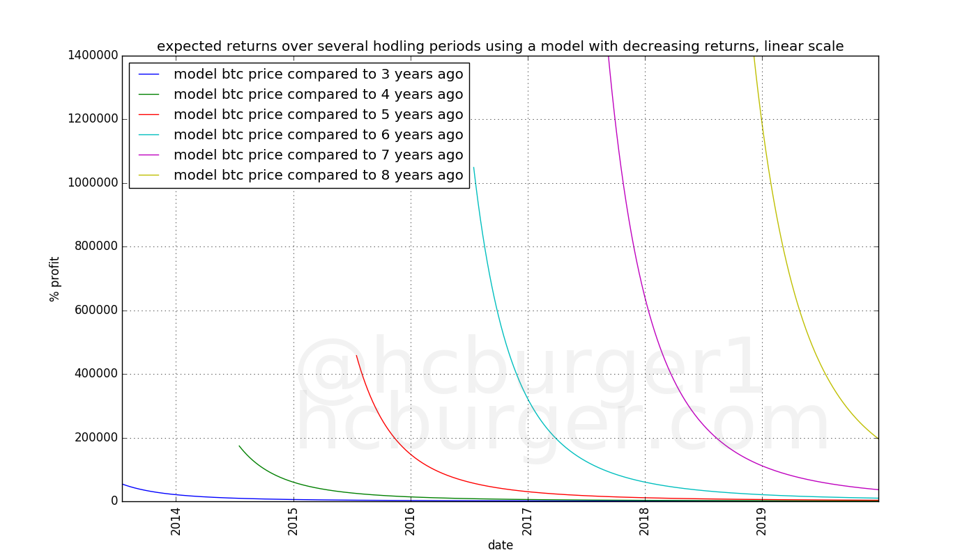 Using a model with diminishing returns, the situation is different: The expected returns depends on when one invested. The lines in the below plot drop sharply, which means that for the same hodling period, buying earlier gives higher expected returns.