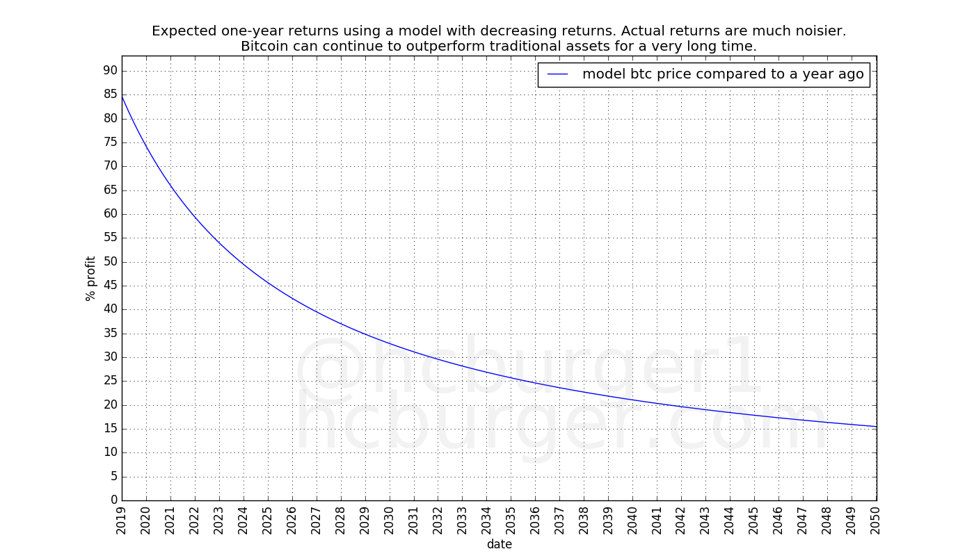 Why would this property not hold anymore? One might argue that past performance is not an indication of future performance, and therefore that the fact that bitcoin’s returns have so far been diminishing does not mean that they will continue to be diminishing in the future. In other words: bitcoin’s returns could become non-diminishing in the future. As arguments against this statement we can say that: