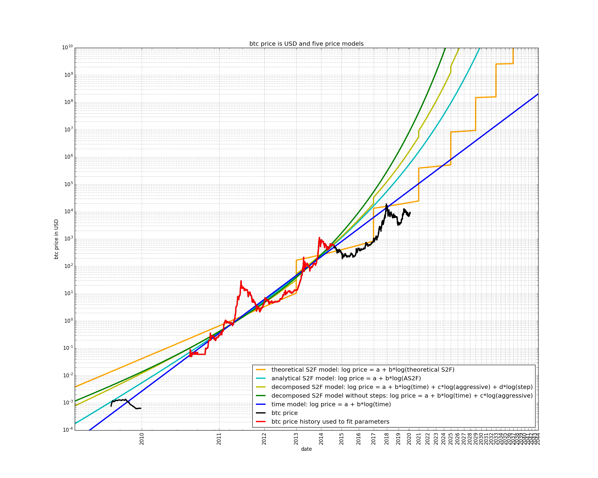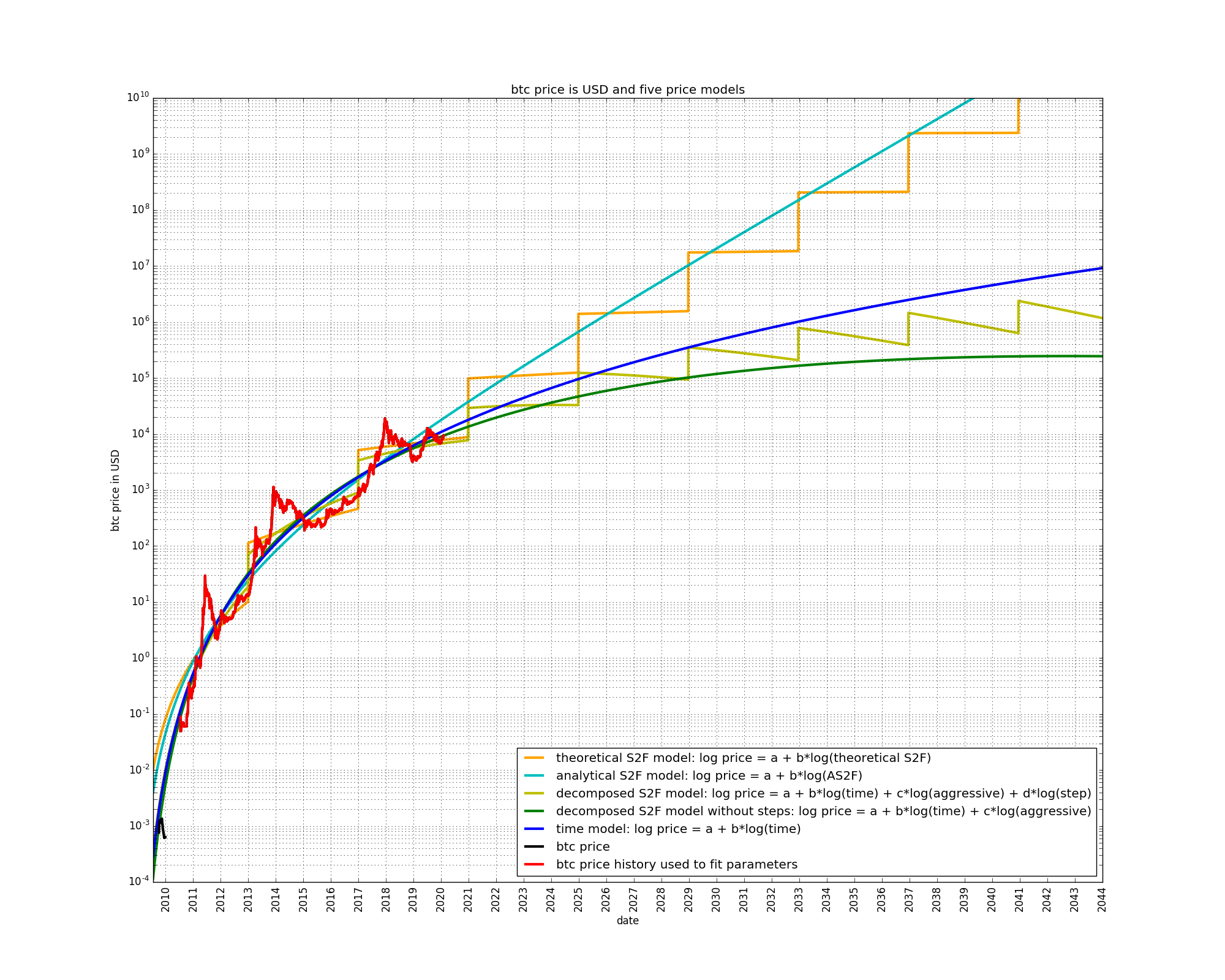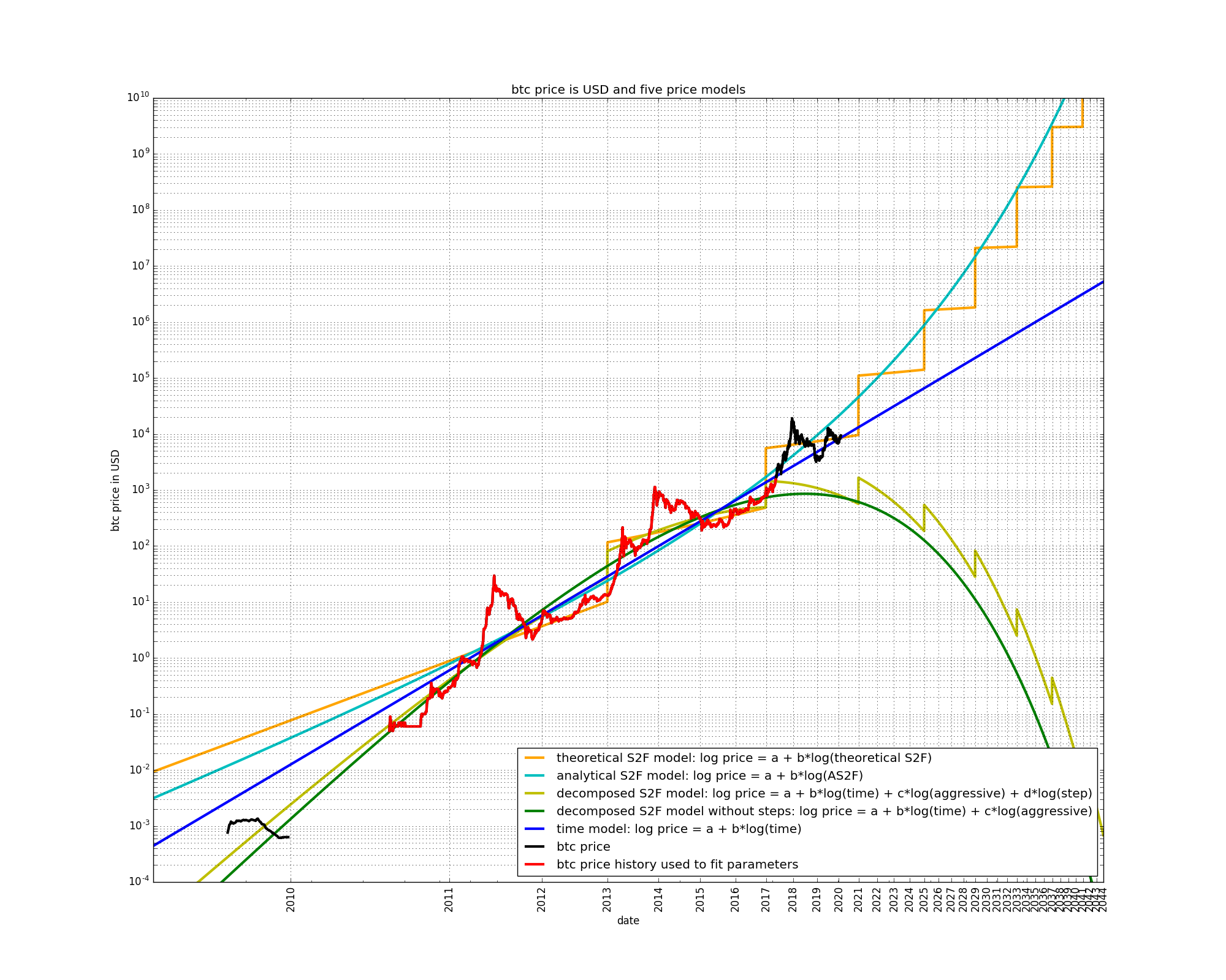 The decomposed S2F models should not be used for actual price forecasts or trading purposes, due to their instability. The decomposed S2F models have more variables, and are therefore more prone to overfitting, a phenomenon we have observed by removing parts of bitcoin’s price history and projecting into the future. The fact that the partially exponential input variable can be weighted independently of the other variables makes the decomposed S2F models more unstable that the plain S2F model, in which the exponential component is coupled with other variables.