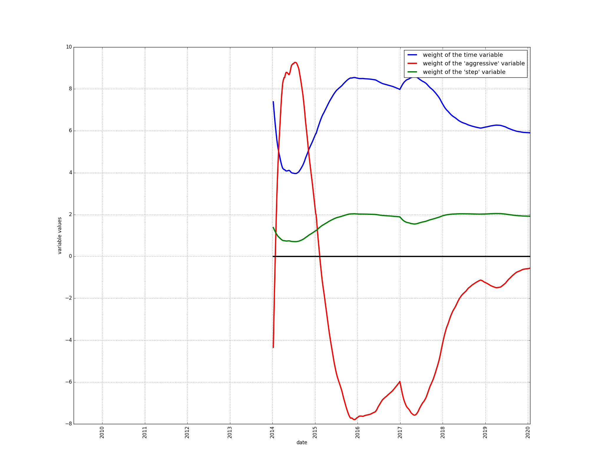 The step variable is given a positive weight starting in 2013, indicating that it is indeed useful in modelling the price. The step variable helps fit the bull markets.